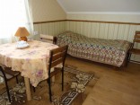 Комната № 34 является комнатой мансардного типа, что и придает ей уютного вида. Комната выполнена в приятном светлом тоне. Одно металло пластиковое окно. Пол устлан ламинатом в декорации дуб. Хорошие двери которые можно закрывать на ключ. В комнате также находится вешалка для одежды, стол и стулья, телевизор. В комнате есть санузел: ванна, умывальник с зеркалом и унитаз. Уютная и красивая комната в которой может поместиться до 4 человек. В ней находится 2 одноместных кровати из натурального дерева и 1 двухместная. В комнате есть телевизор со спутниковым телевидинием.